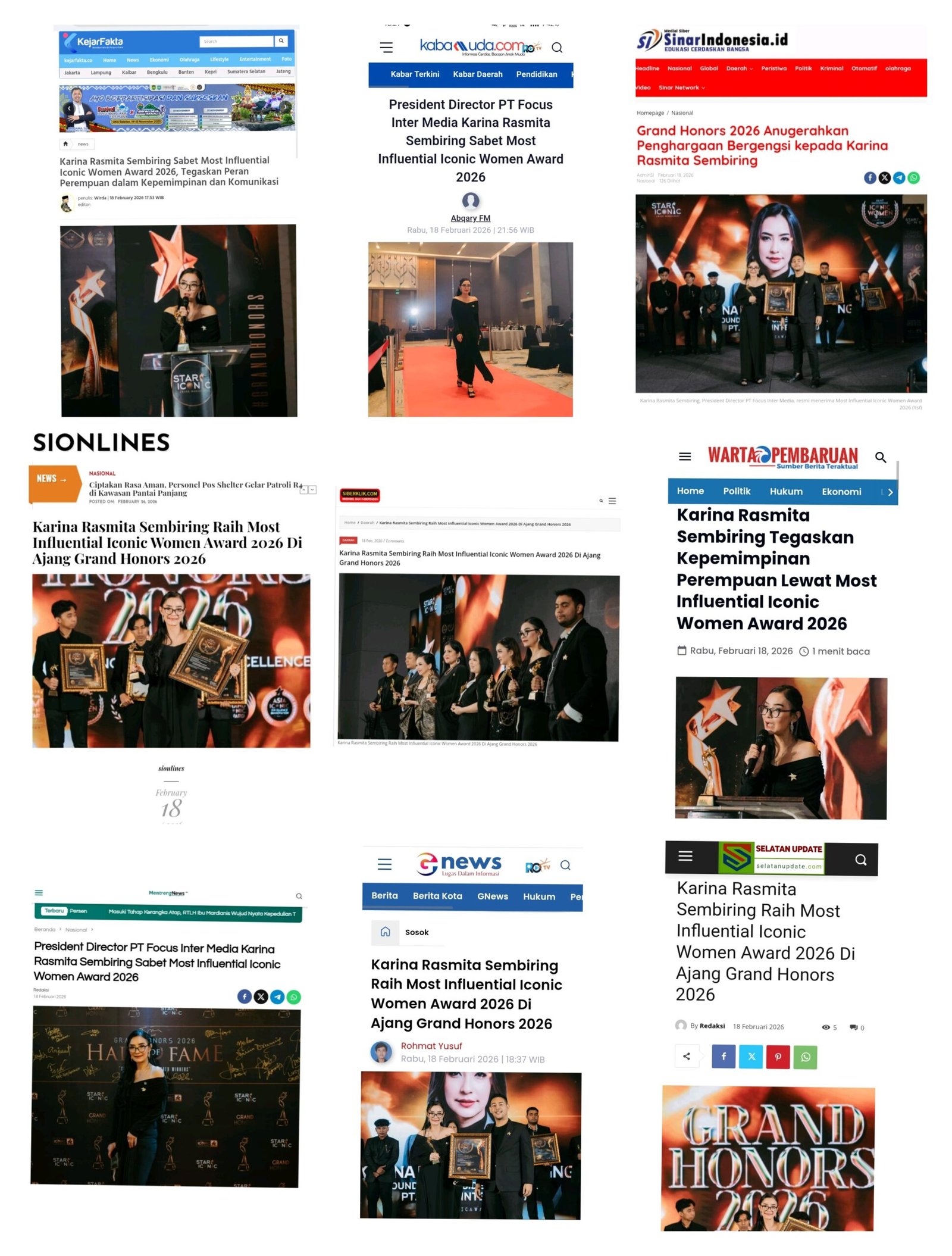 Focusitm.news | Jakarta, Februari 2026 — Sebanyak 32 media nasional dan lokal secara serentak mempublikasikan pemberitaan terkait pencapaian Karina Rasmita Sembiring, President Director PT Focus Inter Media, yang menerima penghargaan bergengsi Most Influential Iconic Women Award 2026 dalam kategori Most Influential Women in Communication & Leadership Development Innovation pada ajang Grand Honors 2026.