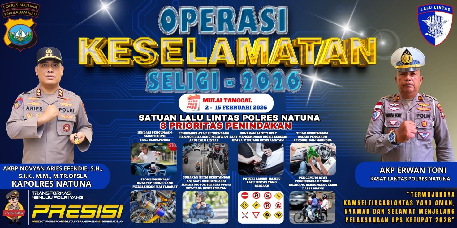 Natuna – Dalam rangka menciptakan kondisi lalu lintas yang aman dan tertib menjelang bulan suci Ramadhan serta pelaksanaan Operasi Ketupat 2026, Polres Natuna melalui Satuan Lalu Lintas resmi menggelar Operasi Keselamatan Seligi 2026. Operasi ini berlangsung mulai 2 Februari hingga 15 Februari 2026.